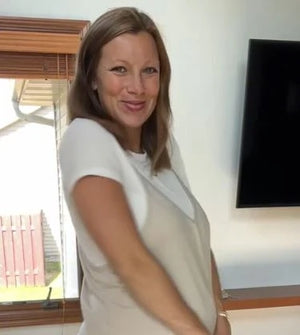 "Ich bin total begeistert! Sie ist ultra bequem an meinem Bauch und verleiht einen schönen Oversize-Look. Vielleicht hätte ich eine M nehmen können, aber die L passt mir sehr gut und ich weiß, dass sie mir bis zum Ende meiner Schwangerschaft passen wird. "